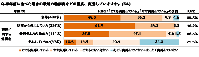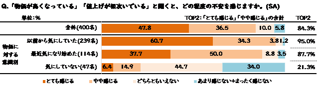 もともと物価意識が強い層ほど、物価高に強い不安を感じ、現在の物価高を強く実感している
