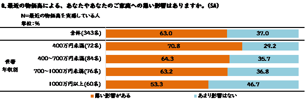 現在の物価高を実感している人の63.0%が「悪い影響がある」と回答しました。これを世帯年収別でみると、400万円未満の層では70.8%、400~700万円未満の層では64.3%、700~1000万円未満の層では63.2%、1000万円以上の層では53.3%となっており、年収が低い層ほど割合が高くなっています。悪い影響の具体的な内容は主に経済的な影響(欲しいモノが買えない、家計圧迫)と身体への影響(精神的ダメージ、健康を損なう)に分かれました。