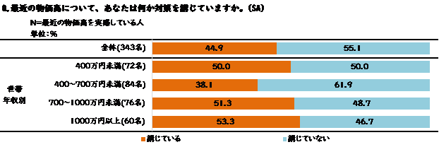 現在の物価高を実感している人の44.9%が対策を「講じている」と回答しました。これは上記の「悪い影響があった」の割合に比べて低く、特に世帯年収が低い層で差が大きい傾向がみられました。世帯年収が低い層は物価高による悪影響を受けやすい上に、対策を講じるのも難しい状況であることがわかりました。