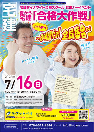 宅建講師歴35年「宅建ダイナマイト合格スクール」のおーさわ校長(大澤茂雄)が講師となり、約8時間の熱いエンタメ型宅建講義イベント“夏から宅建 「ぶっちぎり合格大作戦」”を開催いたします。