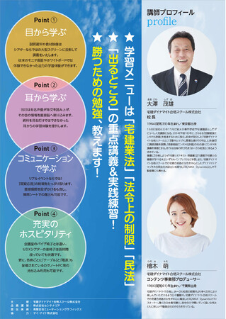 宅建ダイナマイト合格スクールのおーさわ校長(大澤茂雄)が、シアター(映画館)空間をフルに活用し、視覚面や聴覚面に響く「勝つため」の宅建講義を行います。