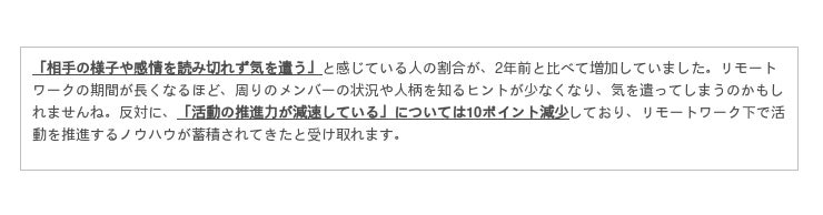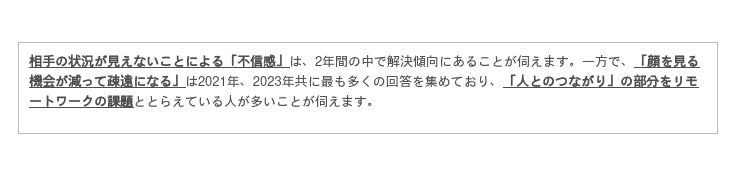 アンケートの結果から、半数以上の人が、出社とリモートワークを併用する「ハイブリッドワーク」を望んでいることがわかりました。リモートワーク時に感じる課題については、「プロジェクトの推進力」や「打合せ」など業務上の課題については改善傾向にある一方、「気を遣う」「疎遠になる」といった気持ちの面での課題は依然として根強いという結果に。これからのオフィスワークでは、「他のメンバーが働く様子を肌で感じられること」がより大切になりそうです。