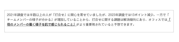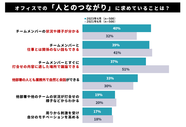 最後に、オフィスでの「人とのつながり」について求めていることを複数回答で質問しました。2021年調査では「チームメンバーとすぐに打合せの内容に適した場所で議論できる」が最も多くの回答を集めていましたが、2023年調査では14ポイント減少。一方、「チームメンバーの状況や様子が分かる」は8ポイント増加しました。