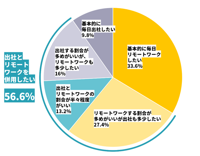 「基本的に毎日リモートワークしたい」と回答した人が33.6%、「基本的に毎日出社したい」と回答した人が9.8%。「リモートワークする割合が多めがいいが出社も多少したい」、「出社とリモートワークの割合が半々程度がいい」、「出社する割合が多めがいいが、リモートワークも多少したい」と回答した人の合計は56.6%という結果でした。