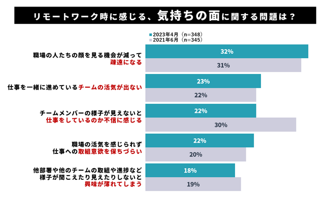 「気持ちの面」に関する具体的な問題について複数回答で訊いたところ、「職場の人たちの顔を見る機会が減って疎遠になる」という項目が、2021年、2023年共に最も多くの回答を集めました。「チームメンバーの様子が見えないと仕事をしているのか不信に感じる」という項目については、2021年と比較して2023年では8ポイント低下しています。
