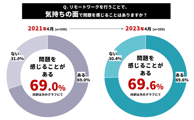 「リモートワークを行うことで、気持ちの面で問題を感じることがありますか?」という質問に対し、2021年の調査では「問題を感じることがある」と回答した人が69.0%、2023年の調査では69.6%という結果でした。