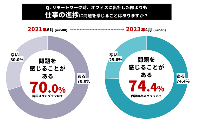 「リモートワーク時、オフィスに出社した際よりも仕事の進捗に問題を感じることはありますか?」という質問に対し、2021年の調査では「問題を感じることがある」と回答した人が70%、2023年の調査では74.4%という結果でした。