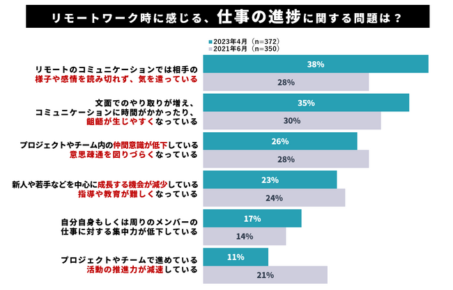 「仕事の進捗」に関する具体的な問題について複数回答で訊いたところ、「リモートのコミュニケーションでは相手の様子や感情を読み切れず、気を遣っている」という項目は、2年前と比較して10ポイント高い結果に。一方で、「プロジェクトやチームで進めている活動の推進力が減速している」という項目は、2年前よりも10ポイント低い結果となりました。