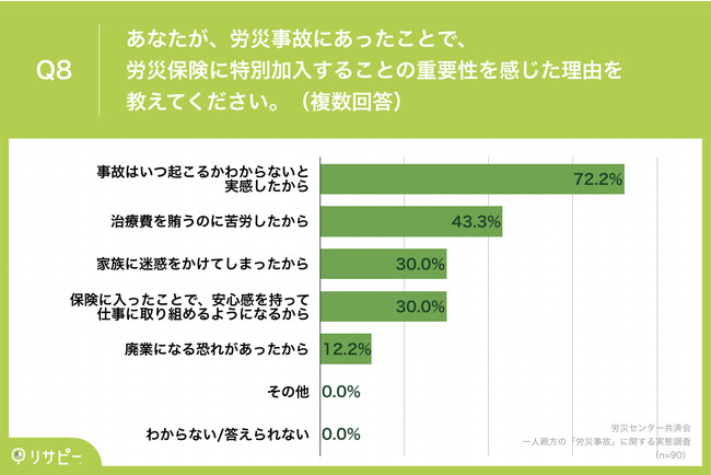 Q7で「非常に感じた」「やや感じた」と回答した方に、「Q8.あなたが、労災事故にあったことで、労災保険に特別加入することの重要性を感じた理由を教えてください。(複数回答)」(n=90)と質問したところ、「事故はいつ起こるかわからないと実感したから」が72.2%、「治療費を賄うのに苦労したから」が43.3%という回答となりました。