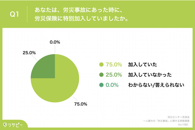 「Q1.あなたは、労災事故にあった時に、労災保険に特別加入していましたか。」(n=106)と質問したところ、「加入していた」が75.0%、「加入していなかった」が25.0%という回答となりました。