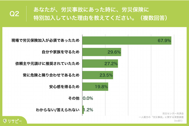 Q1で「加入していた」と回答した方に、「Q2.あなたが、労災事故にあった時に、労災保険に特別加入していた理由を教えてください。(複数回答)」(n=81)と質問したところ、「現場で労災保険加入が必須であったため」が67.9%、「自分や家族を守るため」が29.6%、「依頼主や元請けに推奨されていたため」が27.2%という回答となりました。