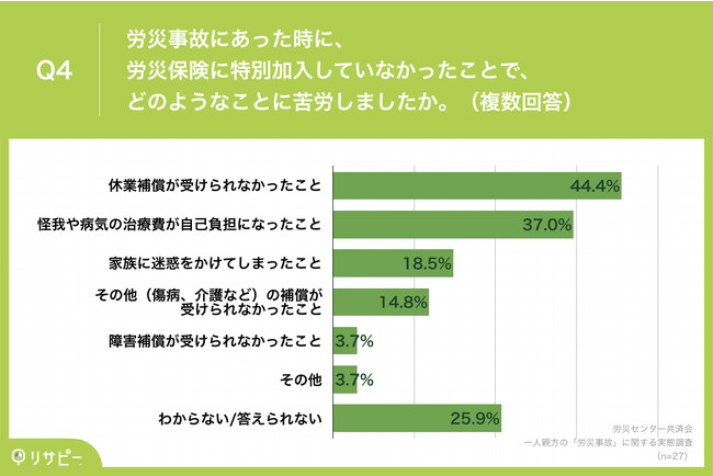 Q1で「加入していなかった」と回答した方に、「Q4.労災事故にあった時に、労災保険に特別加入していなかったことで、どのようなことに苦労しましたか。(複数回答)」(n=27)と質問したところ、「休業補償が受けられなかったこと」が44.4%、「怪我や病気の治療費が自己負担になったこと」が37.0%、「家族に迷惑をかけてしまったこと」が18.5%という回答となりました。