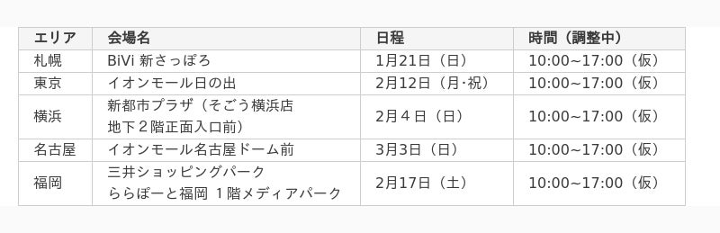 初開催となる今回のキャラバンでは、札幌・東京・横浜・名古屋・福岡 の幼稚園や商業