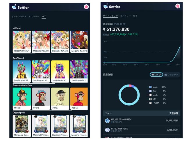 NFTアートやブロックチェーンゲームによりNFTへの注目が年々高まる中、この度暗号資産のポートフォリオ管理ができる「Settlerポートフォリオ」にて所有しているNFTも表示できるように対応致しました。