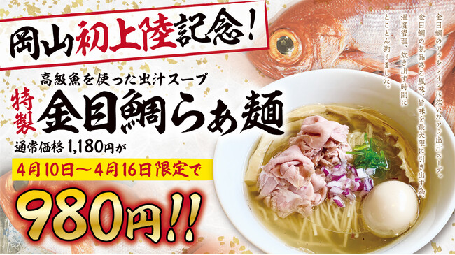 高級魚・金目鯛の気品ある風味、旨味を最大限に引き出した唯一無二の金目鯛らぁ麺・金目鯛つけ麺が岡山初上陸!