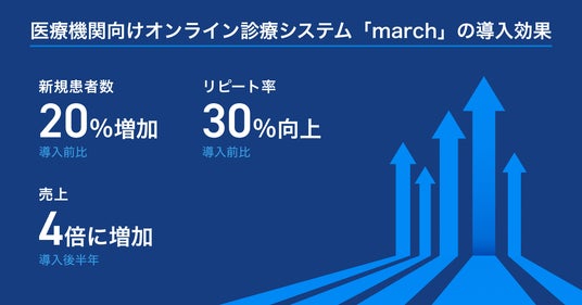 株式会社Wrusty(本社:東京都渋谷区、代表取締役:上田遼)が提供する、医療機関向けオンライン診療システム「march(マーチ)」(https://march-cos.com)の導入医療機関において、「新規患者数が導入前比で20%増加」、「リピート率は30%向上」、さらに「売上は半年で4倍に増加」したという成果が報告されました。また、導入医療機関の継続利用率は97%という高水準を維持しています。