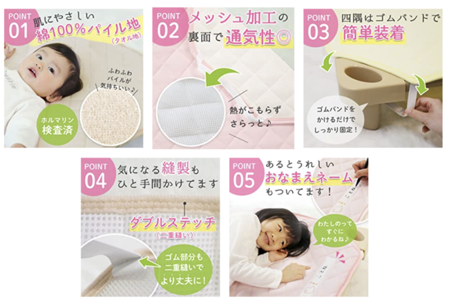 床に直接お布団を敷くことがないため、感染予防やアレルギー予防など衛生面から導入が急速に進んでいるコットにぴったりの「コットカバー」をサイズ・カラーを豊富に取り揃えて展開しております。また昨今ニュースにもなっているオムツを保育園の施設で廃棄するためのゴミ箱も今回あらたに販売を開始しました。抗菌・消臭に優れたアイテムとしてこの数年お客様にご愛顧いただいている製品で、リフィルとのお得のセットもご用意しました。