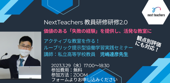 教員の授業研修やICT活用研修、学校広報を支援している株式会社NextTeachers(所在:東京都北区、代表取締役社長:渡辺 健太、以下NextTeachers)は、児嶋達彦先生をお招きし、若手教員や教員志望の学生向けのルーブリックとアクティブラーニングの実践方法に関するWEBセミナーを、3月29日(水)17時より開催します。