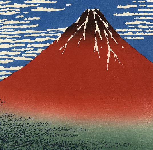 雄大な富士山とたなびくウロコ雲の構図が、美しく気高い北斎の『凱風快晴』。