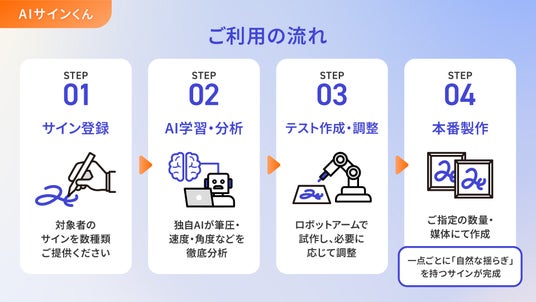 書き順や揺らぎを分析し、AIロボットが1文字ずつペンを持ってで忠実に再現。クラウド保存も可能で、IP資産を守る日本初のサイン代筆サービスです。