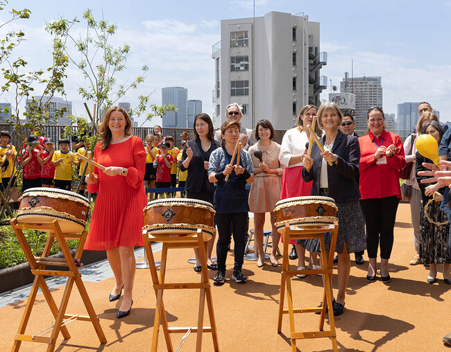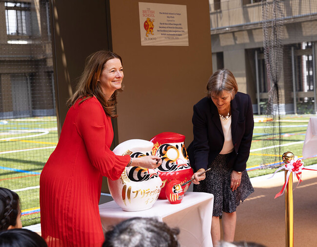 英国教育大臣 ジリアン・キーガン氏が、麻布台ヒルズに新設された(移転申請中)ブリティッシュ・スクール・イン 東京(以下BST)プライマリー スクール(幼児・初等教育科)を訪問し、駐日英国大使ジュリア・ロングボトム氏とともに、同校5階校庭「スカイピッチ」の完成を記念したテープカットを行いました。
