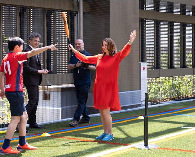 【スカイピッチでBST生徒とティーボールを楽しむジリアン・キーガン英国教育大臣】