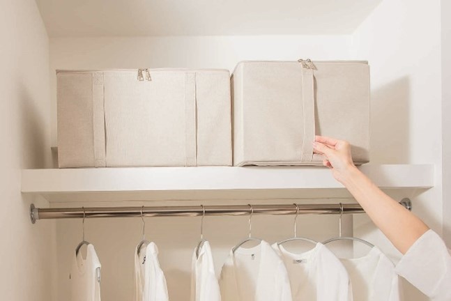 クローゼットの上にある「枕棚(まくらだな)」で使うと便利な収納ボックス。取っ手が縦についているので、高い位置に置いても取り出しが簡単です。シーズンや、人別に衣類をしまうことができ、衣類の管理がしやすくなります。シーズンオフの衣類や使用頻度の近いモノは、普段使いのモノと分けて、このように収納すると便利です!(W34.5×D33×H27cm )