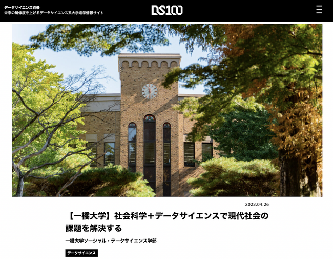 2023年4月にプレオープンしたAI・データサイエンス系大学進学情報サイト「データサイエンス百景(通称DS100)」は、コンテンツ拡充に向け、本日7月19日(水)より広告連動記事の運用を本格的にスタートします。AI・データサイエンス分野の学部・学科情報、研究室情報などを豊富なイラストや図版、写真と一緒にわかりやすく伝えます。大学関係者の皆さま、大学広報を担当する広告代理店の皆さまにぜひご利用いただければと思います。