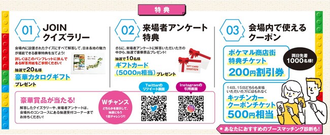 ご来場の皆様にクイズラリー、アンケート抽選、会場内で使えるクーポンなど、様々の特典をご用意しております。