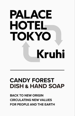 「フォーブス・トラベルガイド2023」のホテル部門にて8年連続5つ星を獲得したパレスホテル東京のレストランで使用した油を活用して作った石けん素地を100%使用。食器洗いにも手洗いにも使用できる、肌にも環境にもやさしいリキッドソープ「キャンディフォレスト ディッシュ&ハンドソープ」。使用するボトル容器は、Kruhiのシャンプートリートメント用に製造されたアルミボトルのうち、印字滲み等で使用していなかったボトルにシールを巻いて使用。PALACE HOTEL TOKYOとKruhiの新たな価値を生むコラボレーションが実現した。