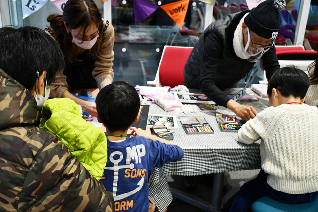 開幕初日となった22日は、平日にもかかわらず、オープンと同時にこども連れのお母さんらが多数、来場してくださいました。地元企業様の出店によるホットワインを含む温かいドリンクをはじめとした飲食・物販マーケットのほか、暖かい室内でこどもと一緒に楽しめるワークショップを多数用意し、「こども連れで安心していけるクリスマスマーケット」が特徴です。
