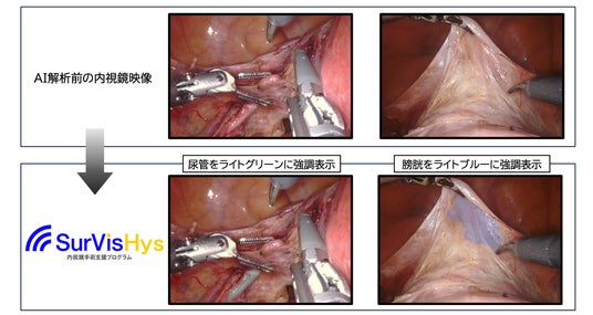 - 「内視鏡手術支援プログラムSurVis-Hys」は、内視鏡下(腹腔鏡下及びロボット支援下)子宮全摘術の手術中に内視鏡画像中の尿管・膀胱部位を検出し、候補領域を手術中に強調表示するプログラムです。性能評価試験ではSurVis-Hysを使用することで、医師の臓器認識感度が有意に向上することが認められました。