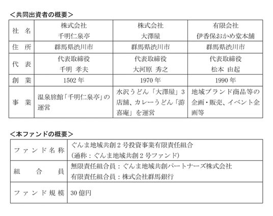 ぐんま地域共創パートナーズ株式会社(代表取締役 鏡山 英男、以下「GRASP」)は、ぐんま地域共創2号ファンド(以下「本ファンド」)を通じて、地域事業者である株式会社千明仁泉亭(代表取締役 千明 孝夫)、株式会社大澤屋(代表取締役 大河原 秀之)、有限会社伊香保おかめ堂本舗(代表取締役 松本 由起)と共同して、まちづくり会社・株式会社(代表取締役 岡 嘉紀、以下「石楽」)を設立しました。