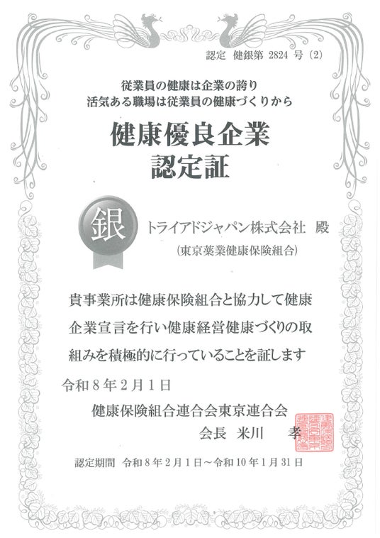 治験の実施支援を通じ、新しい医療の実現を支えるトライアドジャパン株式会社(東京支社:東京都渋谷区、代表取締役:後藤 美穂 以下、トライアドジャパン)は、健康保険組合連合会東京連合会が実施する「健康企業宣言」において、健康経営や健康づくりへの積極的な取り組みが評価され、2026年2月1日付けで健康優良企業「銀の認定」を取得いたしました。今回の認定期間は、2026年2月1日から2028年1月31日までの2年間となり、2024年の初取得に続き、今回が初めての認定更新となります。