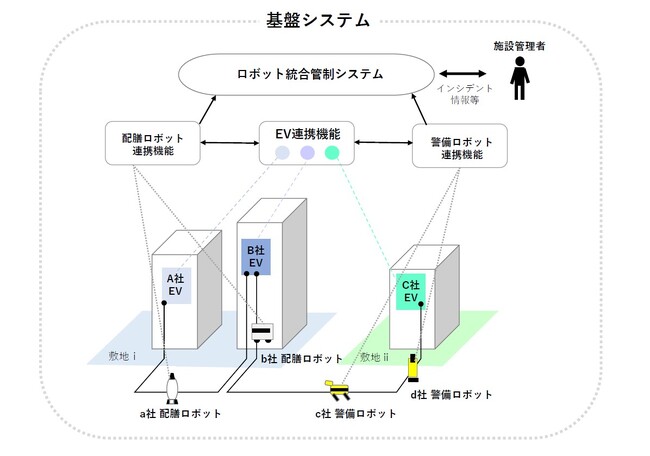 今回導入した基盤システムは、以下3つの独立した機能・システムで構成されています。本基盤システムを導入することで、これまで困難であった、各種ロボットが同一施設内で上下階の移動を含め自由に走行できる環境と、施設管理者が各種ロボットを一元的に監視できる体制を構築できます。