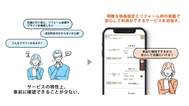 世の中の多くのサービスが、ホームページやSNSでデザインや金額を気軽に確認ができる中、お客様のジュエリーに合わせてデザインを提案し、金額を算出しなければいけないジュエリーリフォームのサービスは、手軽さや価格の明瞭さに欠けていました。