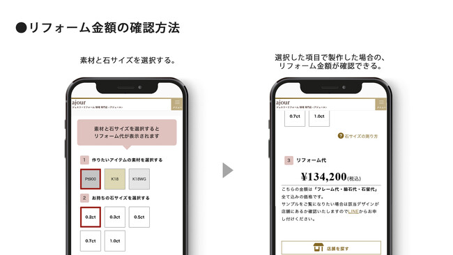 ジュエリーリフォームをする場合、リフォーム費用やデザインは店舗に来店し確認をしなければいけないお店が大半を占めています。ジュエリーリフォームを多くの方に気軽に触れていただけるよう、ジュエリーリフォーム・修理専門店のajour<アジュール>では、リフォーム枠のデザイン検索・自動見積もりができる、「デザインカタログ」ページ(https://ajour.jp/design/)を公式ホームページに設けております。