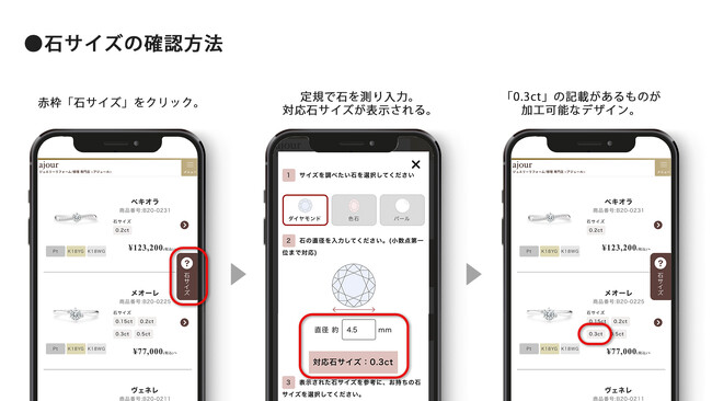 また、リフォームを初めて受ける人やジュエリーに詳しくない方でも簡単に調べられるよう、お持ちのジュエリーに留められた石の大きさを簡単に確認ができるガイドもつけています。定規で石を測定し、数値を入力すると、石サイズが自動で算出されます。