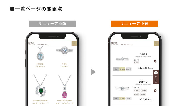 「お持ちの石サイズが留められるリフォーム枠なのか」「費用はいくらなのか」一覧ページで確認ができるよう改修を行いました。並んでいる他のリフォーム枠と価格やデザインを比べながらリフォーム枠を検討をすることができます。