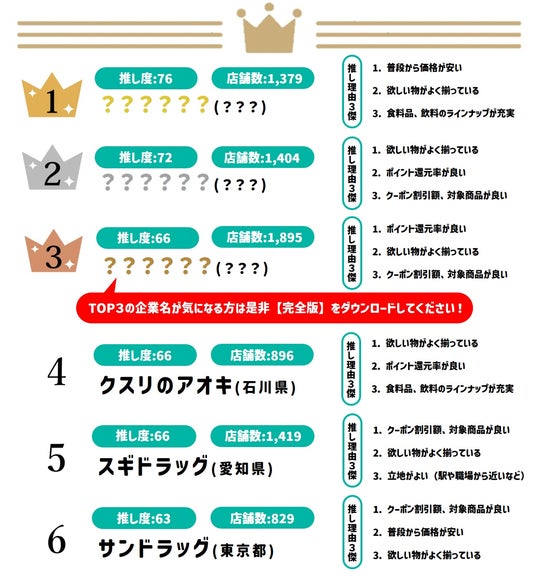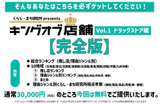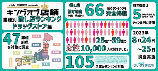 生活者の変化のキザシをとらえ、徹底的にエリアにこだわる"くらし・まちマーケティング(R)"を掲げる城北宣広株式会社(本社:大阪市北区、代表取締役社長:竹内俊文、以下「城北宣広」)は、生活者が『実際に利用している店舗』『推している店舗』『どうしてその店舗が好きなのか』を明らかにし、ランキングとして可視化する小売企業の業種別人気店舗調査ランキングを始めました。今回はその第一弾ドラッグストア編(2023年秋)をご案内させていただきます。