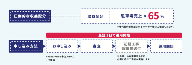 今回募集を開始するRaku-P LIGHTオーナーは今までの駐車場運営からは考えられなかった”概念を覆すシンプルさ”を実現した駐車場です。今まではあり得なかった駐車場を整備する際の初期費用¥0や、明日からでも駐車場運営も実現可能な手軽さを実現しました。例えば「1ヶ月出張でいないから」などの運用も可能。さらに今まで活用出来ていなかった山間の土地や1車室のみしか作れない極小の土地もRaku-P LIGHTであれば運用ができます。いつでもフレキシブルに眠っている土地でも運用が叶います。あなたもライトに始めて駐車場運営をしてみませんか?