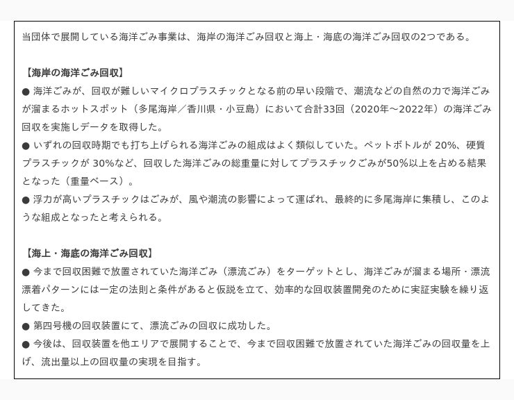現在当団体では、海洋ごみ回収技術開発のために、より多くの協力者と一緒に海洋ごみの場所や時期が調査できる海洋ごみMAPを作ることを目的としたクラウドファンディングを実施中です。