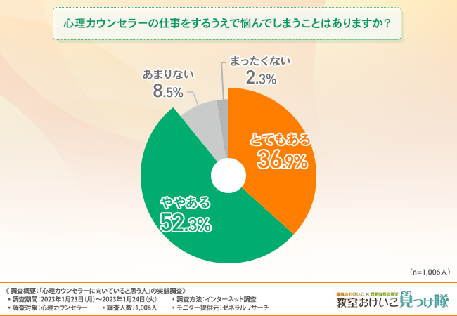 「心理カウンセラーの仕事をするうえで悩んでしまうことはありますか?」と質問したところ、『とてもある(36.9%)』『ややある(52.3%)』『あまりない(8.5%)』『まったくない(2.3%)』という回答結果になりました。