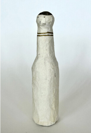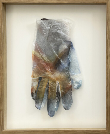私はこの生命のない薄い皮膜を表現するために雁皮紙という宙にかざすと向こう側が透けるほど厚みの薄い種類の和紙を使用し、衣服を作る工程と同様に縫製し作品を制作している。