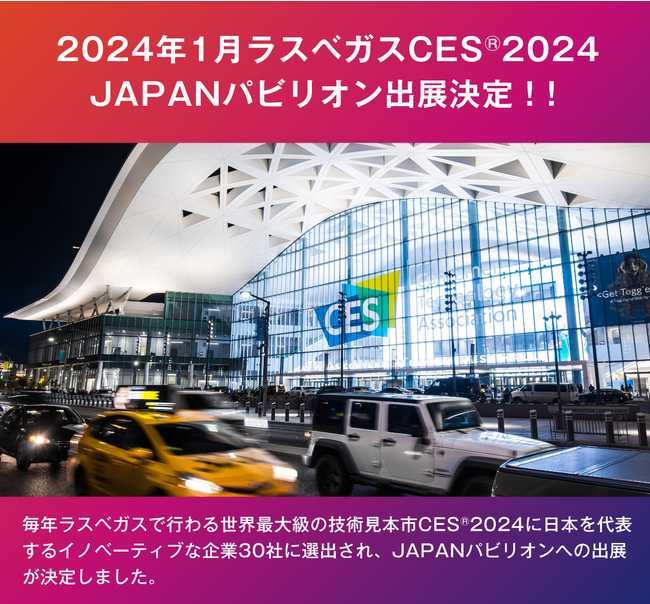 毎年ラスベガスで行わる世界最大級の技術見本市CES(R)2024に日本を代表するイノベーティブな企業30社に選出され、JAPANパビリオンへの出展が決定しました。