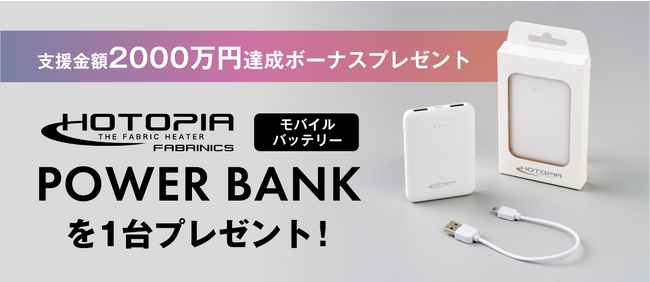この度、TIMELINEにて「WILLTEX(R)」プロジェクトの支援金額が2000万円を超えた場合、支援していただいた皆様全員にHOTOPIA(R) POWER BANK(モバイルバッテリー)を1台プレゼントいたします。
