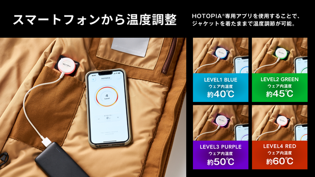 HOTOPIA(R)専用アプリを使用すれば、ジャケットを着たまま温度調節が可能。