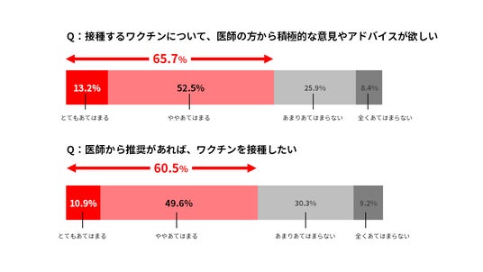 ワクチン接種に関する質問において、「医師から積極的な意見やアドバイスが欲しい」と考えている人は65.7%にのぼり、「医師から推奨があればワクチンを接種したい」人は60.5%でした。