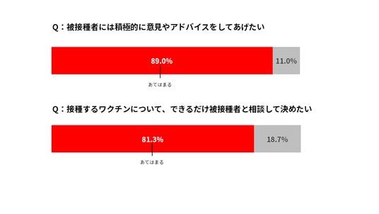 一方、医師もワクチン接種に対しては、「被接種者には積極的に意見やアドバイスをしてあげたい」と考える医師が89.0%、「接種するワクチンについてできるだけ被接種者と相談して決めたい」と考えている医師が81.3%という結果でした。