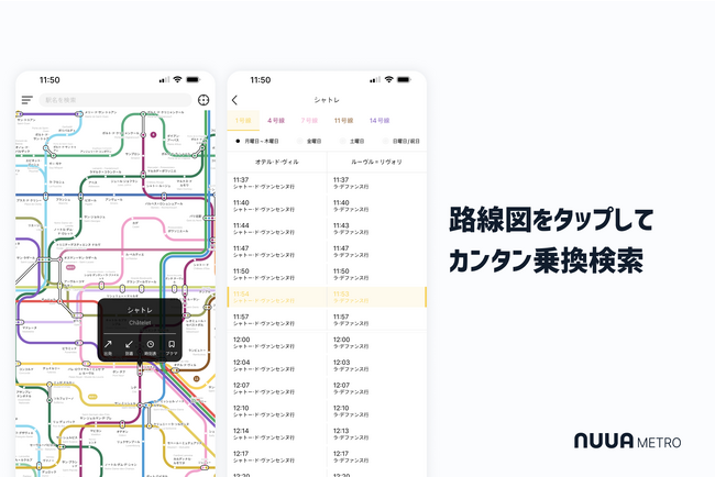 「NUUA METRO」は、アプリひとつで全16か国24エリアの路線図を見ながら乗換検索ができる、多言語・オフライン対応の乗換案内アプリです。 路線図をタップして出発・到着駅を選ぶだけで、簡単に乗換検索ができます。
